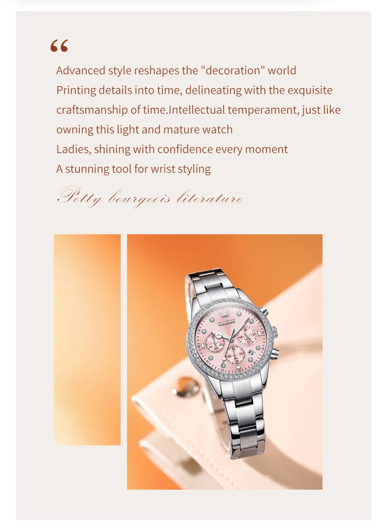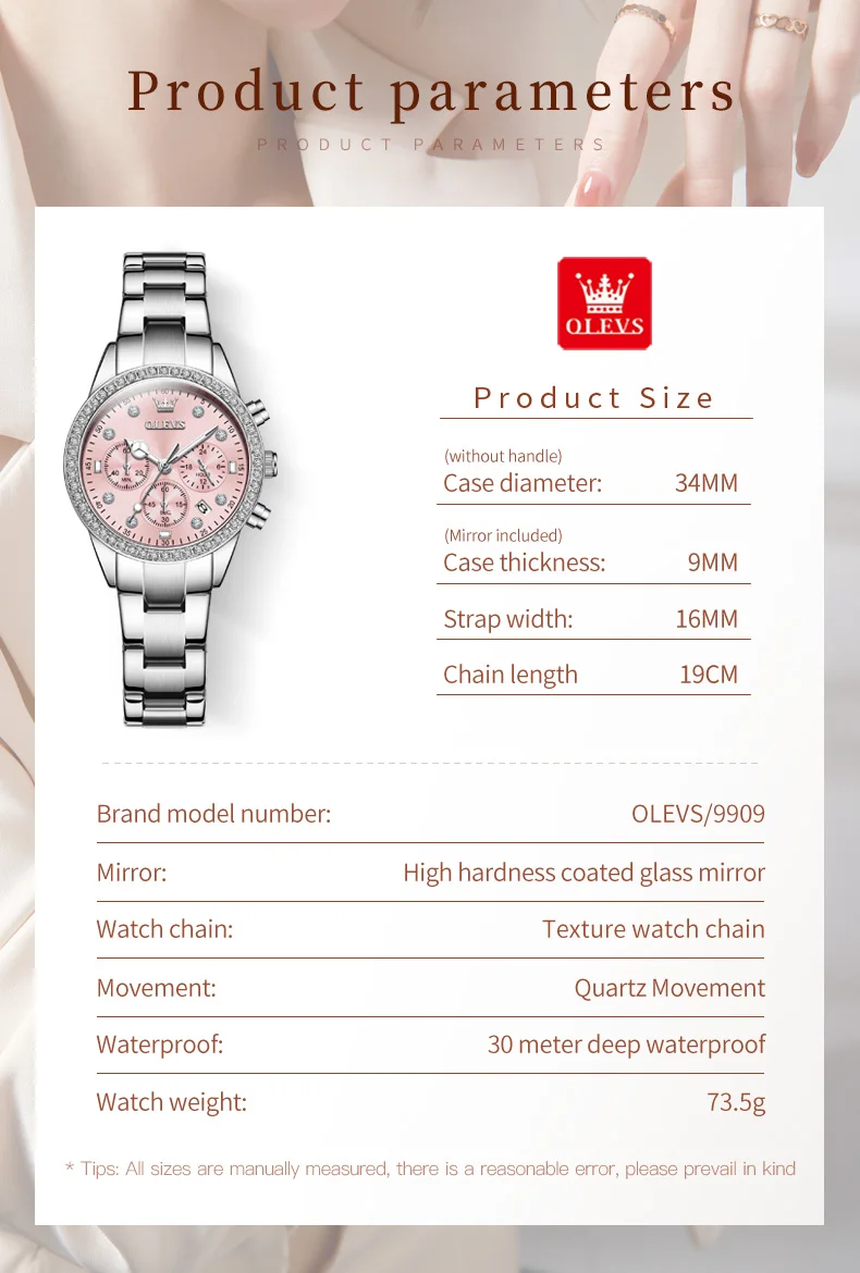 Fall in love with the **OLEVS 9909 Women’s Watch**, a luxury accessory that combines sophisticated design with practical features. With a delicate rose dial and crystal embellishments, this watch is perfect for women seeking elegance and precision in their everyday life.